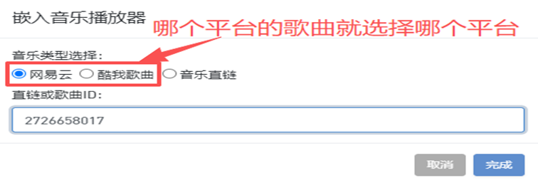 3、音乐试听,发布框下部“插入音乐”,将对应平台音乐ID填上直接确认即可!【优先:酷我音乐】及【网易云音乐ID(非VIP)】